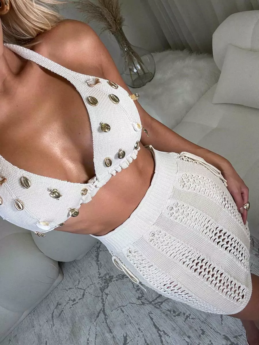 Conjunto 3 peças, short saia e Croppd todo trabalhado em conchas… Qualidade premium!