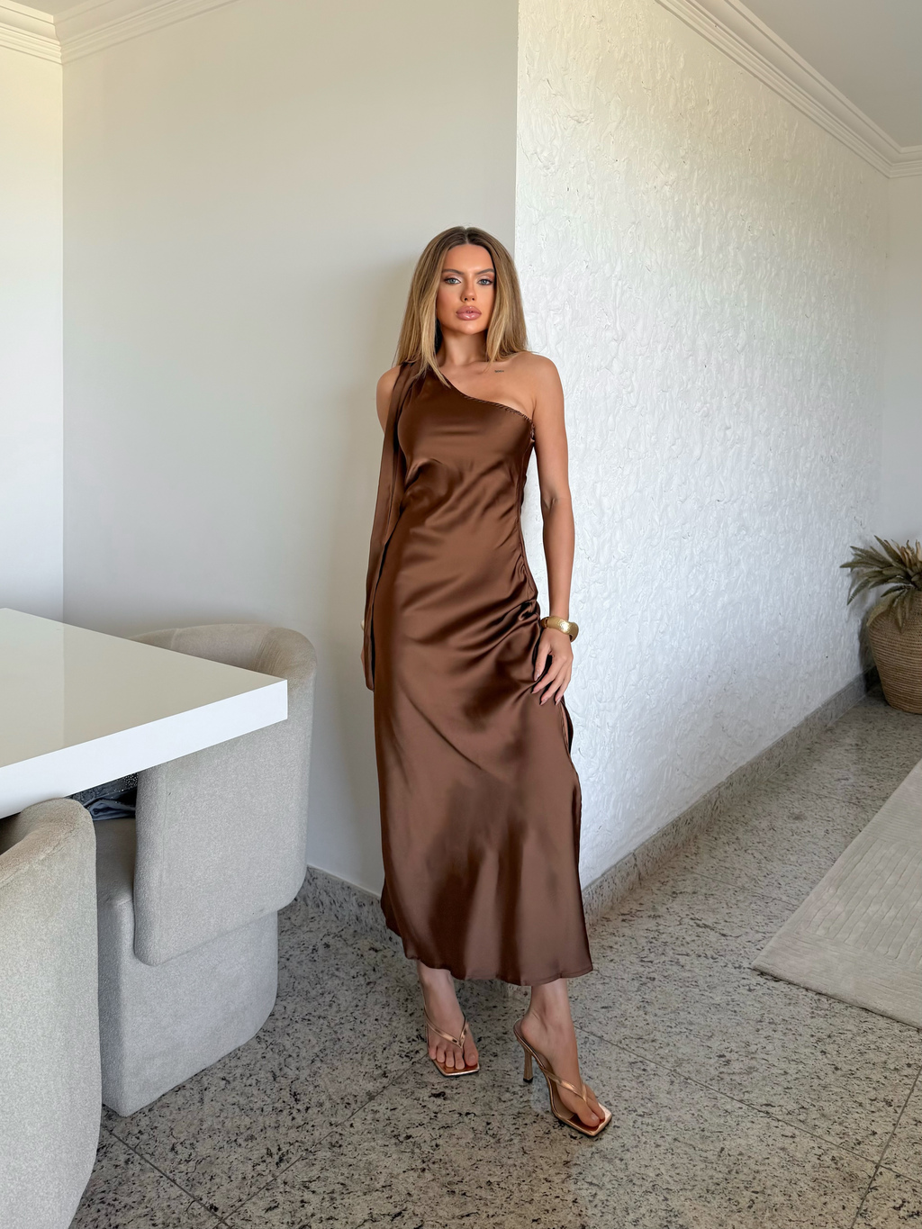 Descubra a elegância do Vestido Acetinado Kendel, uma peça que se destaca pelo seu design chique e sofisticado. Com amarração no ombro, este vestido é perfeito para quem busca um toque de glamour em qualquer ocasião.