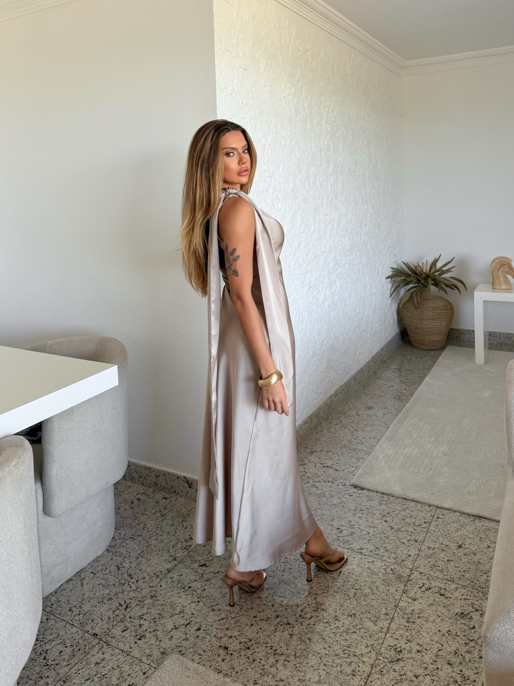 Feito em tecido acetinado de alta qualidade, o vestido proporciona um caimento perfeito e um brilho sutil que encantará a todos. Ideal para festas, jantares ou eventos especiais, ele combina conforto e estilo de forma única.